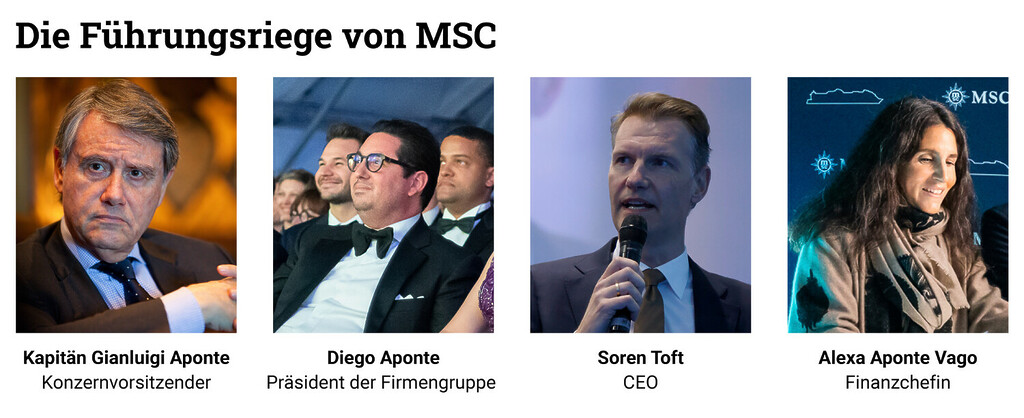 Die Familie hält sich zwar den CEO Toft. Die zentralen Themen sind jedoch in Familienhand: Sohn Diego ist Präsident der Gruppe, Tochter Alexa Aponte Vago leitet die Finanzen, Schwiegersohn Pierfrancesco Vago führt das Kreuzfahrtgeschäft. Und die Gattin Raffaela Aponte dekoriert die Passagierschiffe.