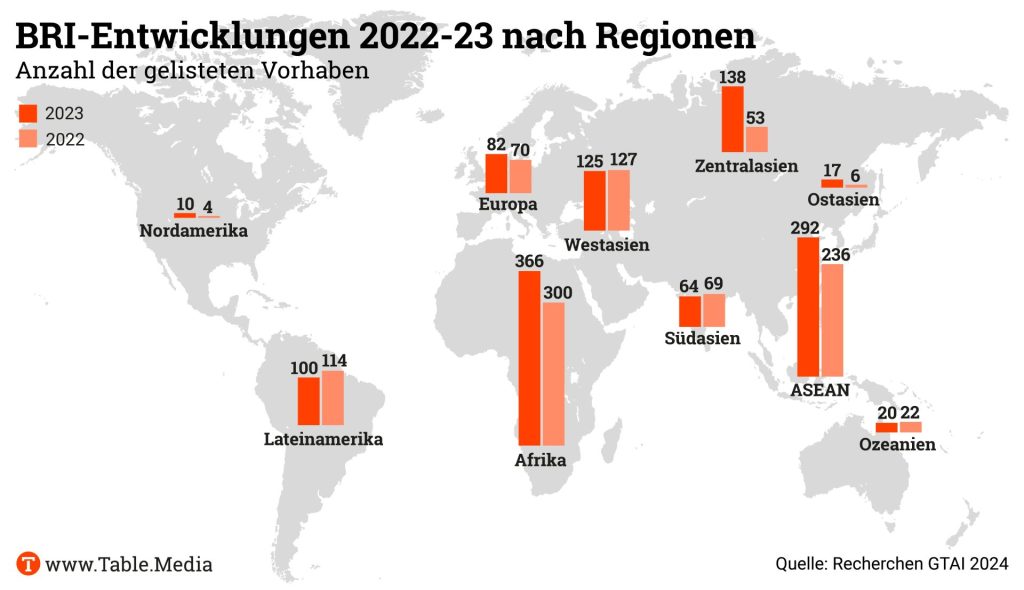 Die einzige Weltregion mit einem deutlichen Rückgang der BRI-Projekte ist Lateinamerika. Dort ging die Projektzahl um 11,4 Prozent zurück. Projekte in Europa verzeichnen nur einen leichten Zuwachs.