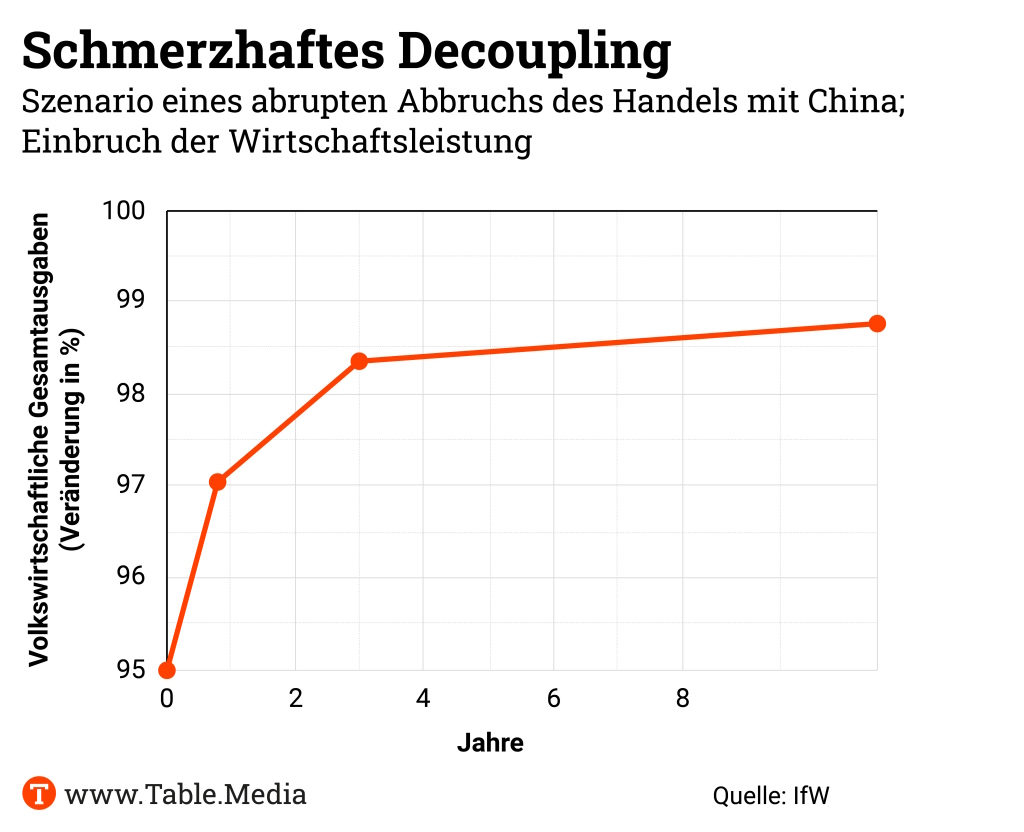 Den IfW-Ökonomen haben den großen Unterschied zu anderen zurückliegenden Krisen also berücksichtigt. Anders als die Auswirkungen der Pandemie, von der eine schnelle Erholung möglich war, würde eine Entkopplung von China auch mittel- und langfristig noch einen Wohlstandsverlust bedeuten, also noch nach vier bis fünf Jahren. Und die Voraussetzung dafür wäre, dass sich die deutsche Wirtschaft auf die neue Realität eingestellt und alternative Handelsbeziehungen aufgebaut haben müsste.