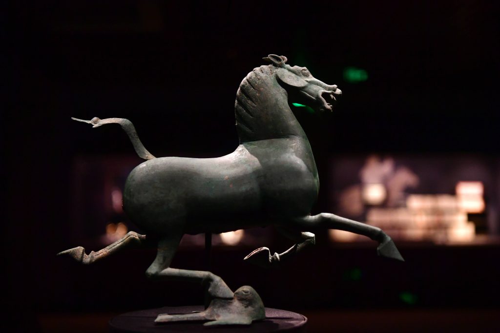 Shrek? Nein, bei diesem “Pferd” handelt es sich nicht um den Helden eines Animationsfilms. Das Foto zeigt eine Touristin und einen Mitarbeiter eines Souvenir-Ladens des “Provinz-Museums von Gansu”. Die Pferde-Maske ist an eine grün-bronzene Pferde-Statue angelehnt, die 1960 ausgegraben wurde und im Museum in Gansu ausgestellt wird.