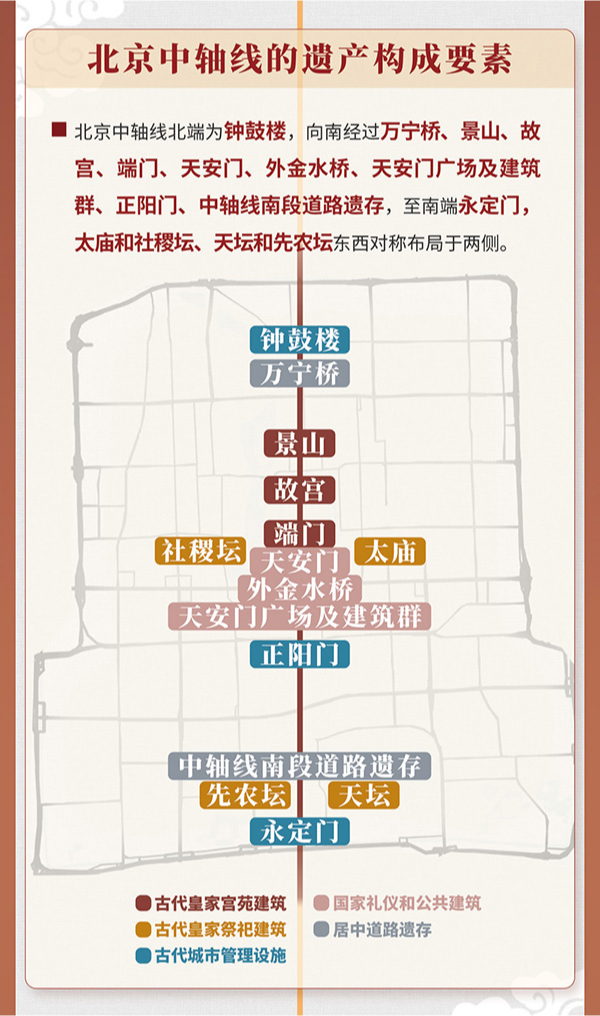 Aufzählung des Gebäudeensemble, das entlang und auf der Achse steht. Ausdrücklich sind der “Tiananmen-Platz einschließlich der Bautengruppe auf dem Platz” Bestandteile der Achse, die seit Ende Juli unter UNESCO-Welterbe steht.