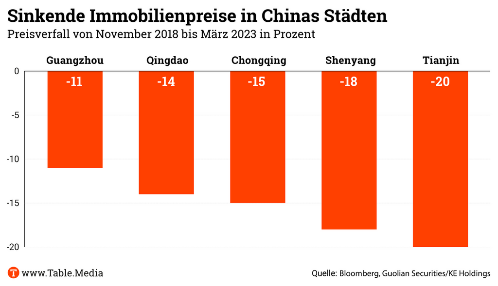 Das Bild, das sich bei Immobilienmaklern und privaten Datenanbietern ergibt, ist einem Bericht von Bloomberg zufolge dennoch weitaus düsterer. Analysten haben Immobilienmakler zu den tatsächlichen Preisen befragt und kommen zu dem Ergebnis, dass die Preise für Bestandsimmobilien in erstklassigen Vierteln großer Metropolregionen wie Shanghai und Shenzhen sowie in mehr als einem Dutzend weiterer Städte um mindestens 15 Prozent gesunken sind.