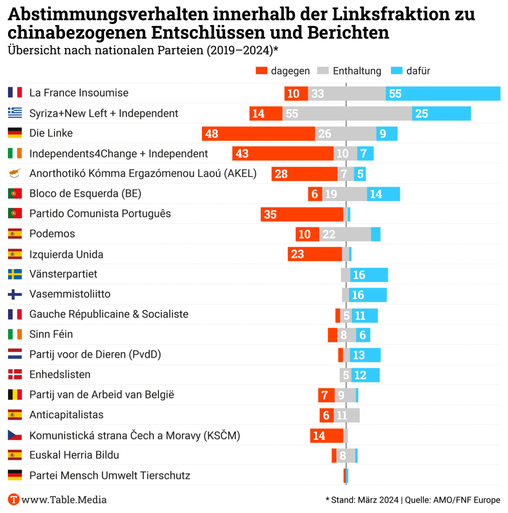 Bei der Linken-Gruppe, so analysieren die Autorinnen, sei das Abstimmungsverhalten nicht ganz so klar. Die Fraktion ist mit 22 Parteien sehr fragmentiert. Thomas Geisel, einer der Spitzenkandidaten des BSW, positioniert sich china-freundlich und plädiert für eine engere Zusammenarbeit mit Peking. Carola Rackete, Kandidatin der deutschen Linken, hat dagegen die Unterstützung der autoritären Führung Chinas in der Vergangenheit offen kritisiert. Martin Schirdewan, aktuell Linken-Abgeordneter im EP, lehnt eine Konfrontation mit China ab und sucht offen den Dialog mit Peking.