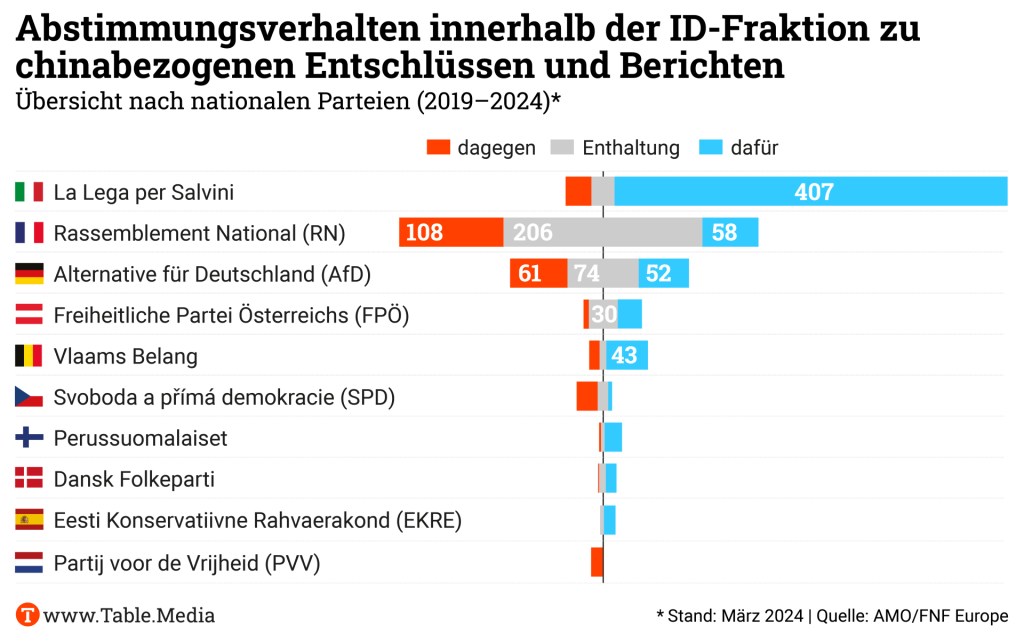 Bei den anstehenden Europawahlen könnten vor allem extrem rechte Parteien Land gut machen. Davon profitiert wiederum China, wie eine neue Studie der Prager Association for International Affairs (AMO) detailliert darlegt. Extrem rechte und teilweise auch linke Parteien haben in der Vergangenheit bereits viel dazu beigetragen, die EU in eine China-positivere Richtung zu lenken. So stimmten Abgeordneten des ID-Blocks häufig entgegen gängiger EU-Positionen, etwa im Bereich des De-Risking, der EU-China-Strategie oder in Fragen zur Freiheit Taiwans.