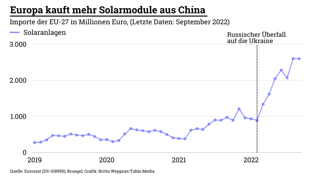 Bei den europäischen Importen zeigt sich dementsprechend ein deutliches Bild. 90 Prozent der EU-Importe bei Solarmodulen geht auf China zurück. Seit dem russischen Angriff auf die Ukraine haben sich die Importe verdoppelt.