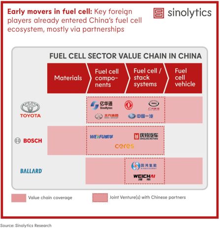 Dennoch haben einige internationale Unternehmen wie Toyota, Bosch und Ballard das große Marktpotenzial von Brennstoffzellenanwendungen in China erkannt. Sie sind frühzeitig in diesen Sektor eingestiegen.