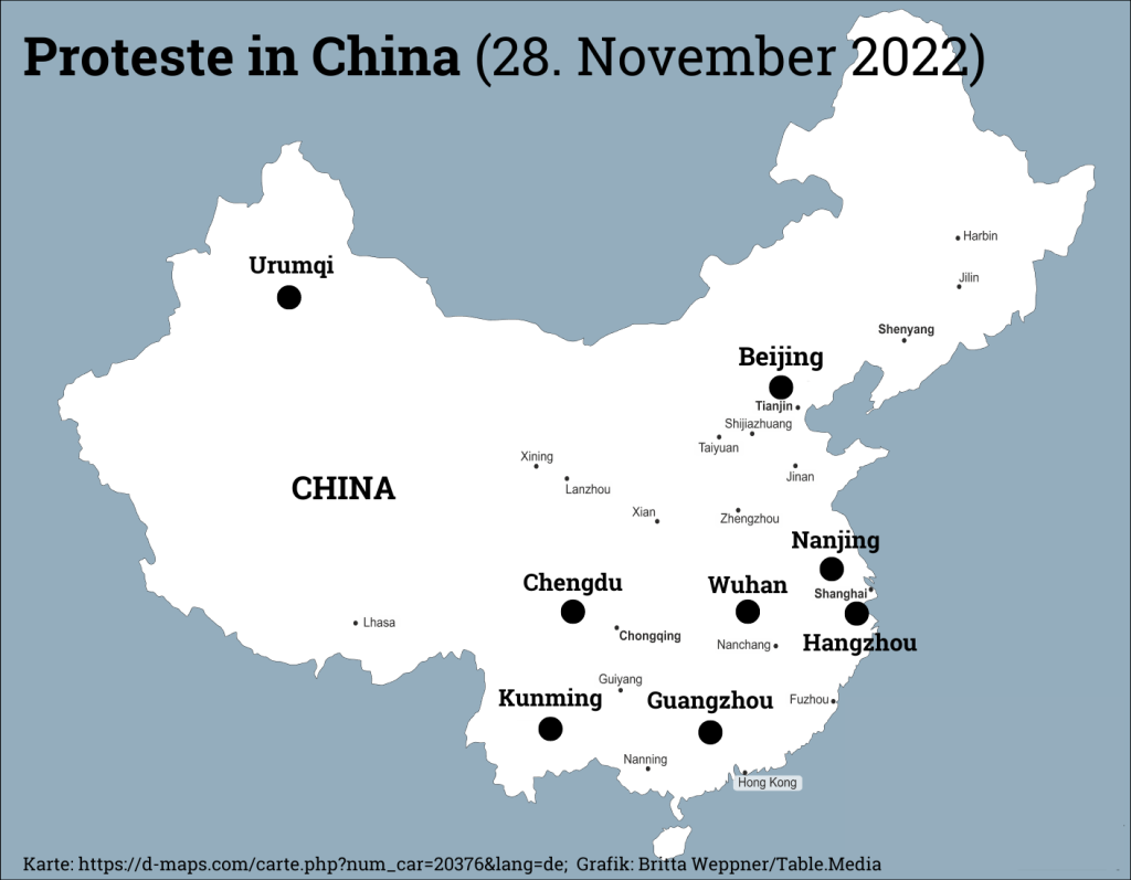 Der Präsident der Europäischen Handelskammer in Peking, Jörg Wuttke, hat sich kurz vor Ausbruch der jüngsten Proteste genau diese Punkte als Risikofaktoren bezeichnet, die jetzt die Hauptthemen der Protestierenden sind. Wuttke beklagt das weit verbreitete Gefühl des Eingesperrtseins, die Sinnlosigkeit vieler Maßnahmen und die Konsumschwäche. “China hat es verpasst, den Schritt weg von der totalen Kontrolle vorzubereiten”, erklärt Wuttke. Gerade deshalb drohe nun der Kontrollverlust.