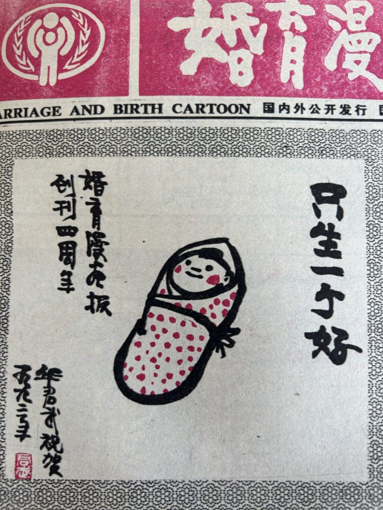 Chinas Karikaturisten-Altmeister Hua Junwu zeichnete 1993 in der Hochphase der Ein-Kind-Politik zur Unterstützung der Kampagne sein bekanntes Bild “Nur ein Kind auf die Welt zu bringen ist gut.”