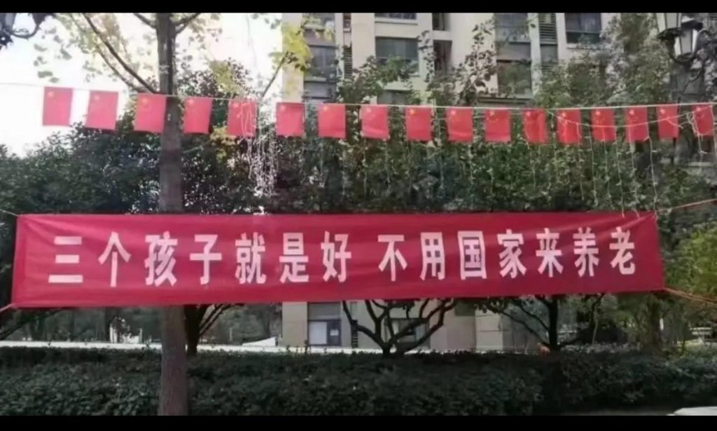 Umdenken in Peking nach dem rapiden Fall der Geburtenraten. Heutige Parole auf Chinas Straßen, um die Bevölkerung zum Kinderkriegen zu animieren. Auf der Banderole steht als chinesischer Vers: “Drei Kinder sind gut und bringen Segen – so braucht der Staat nicht die Alten pflegen.”