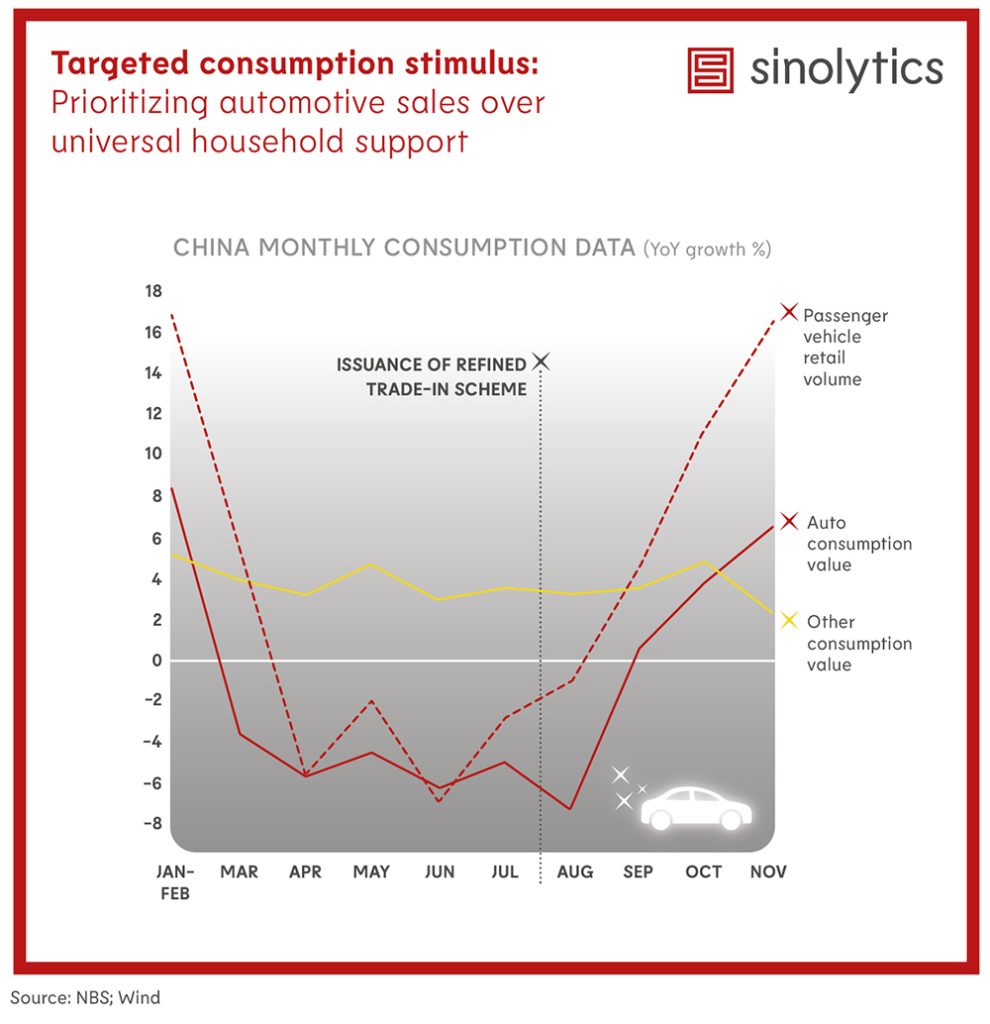Dank dieser Maßnahmen konnte eine Trendwende im Automobilsektor herbeigeführt werden: Das Einzelhandelsvolumen von Pkws hat sich von einem negativen Wachstum zu einem zweistelligen Anstieg von 11,3 Prozent im Oktober und 16,5 Prozent im November erholt.