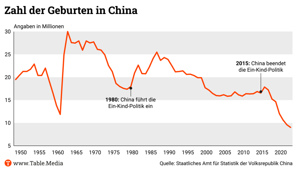 Chinas Statistikbehördehat neben fragwürdigen Konjunkturdaten auch beunruhigende Zahlen zur Bevölkerungsentwicklung veröffentlicht. Demnach hat sich der Rückgang der Geburtenrate seit dem vergangenen Jahr weiter beschleunigt. Nach Angaben des Statistikamtes lebten Ende Dezember rund 1,409 Milliarden Menschen in der Volksrepublik, 2,08 Millionen weniger als ein Jahr zuvor. Bereits 2022 war Chinas Bevölkerung erstmals seit sechs Jahrzehnten geschrumpft, allerdings fiel der Rückgang damals mit rund 850.000 Menschen deutlich geringer aus als im vergangenen Jahr.