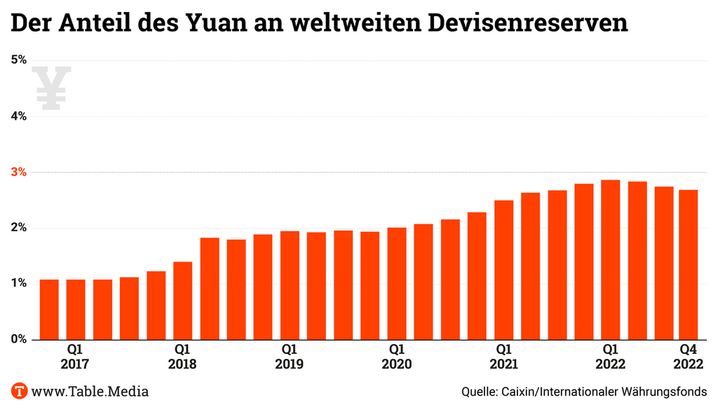 Die Jingji Ribao, 经济日报, Chinas einzige Wirtschaftszeitung, die für die Partei sprechen darf, interviewte im Januar 2023 führende Geld- und Finanztheoretiker des Landes, wie Xis neue Formel zu verstehen sei. Sie warnten: China brauche noch viel Zeit und Reformen zur Internationalisierung des Volksgeldes.