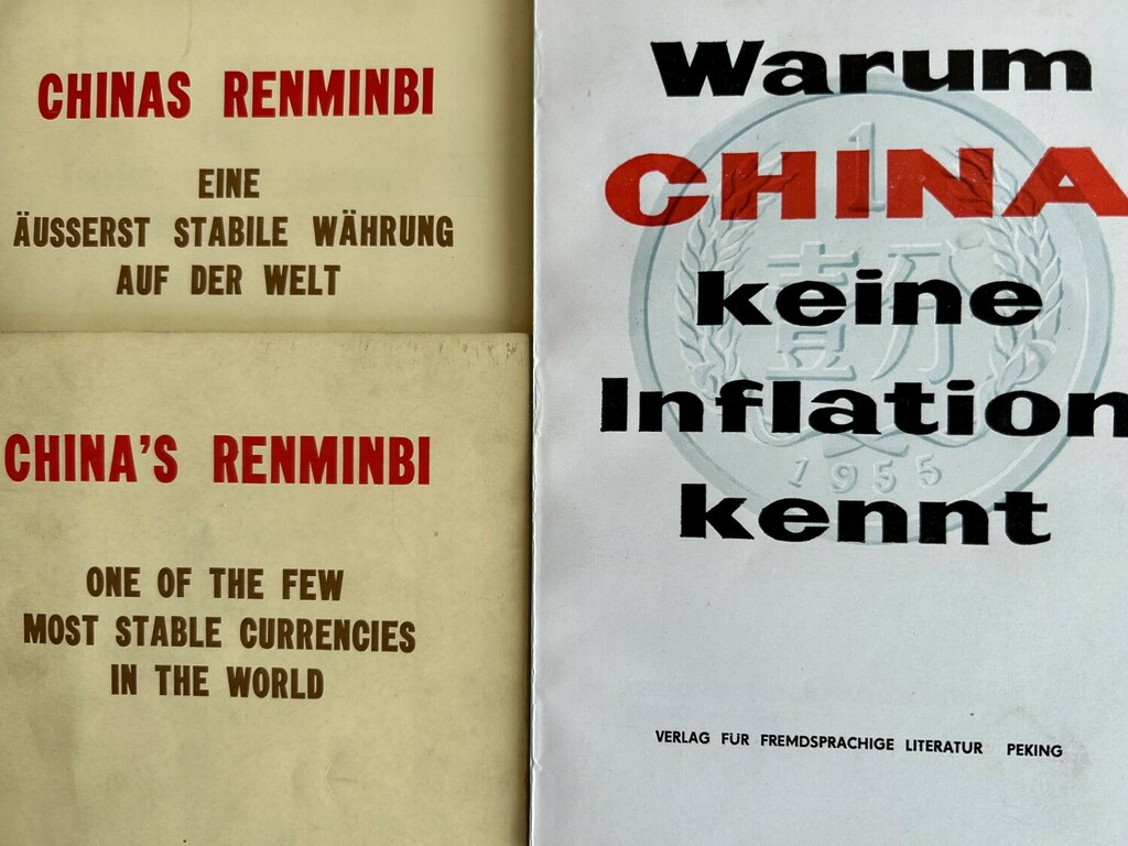 Große Worte machte China schon immer. Jüngst stieß ich auf zwei vergilbte Propaganda-Schriften aus der Zeit der Kulturrevolution. “Chinas Renminbi. Eine der stabilsten Währungen der Welt” (中国的人民币 世界上少有的多最稳定的货币), hieß die erste Broschüre, die 1969 sogar in Deutsch erschien. Die Zweite kam 1976 heraus: “Warum China keine Inflation kennt?”