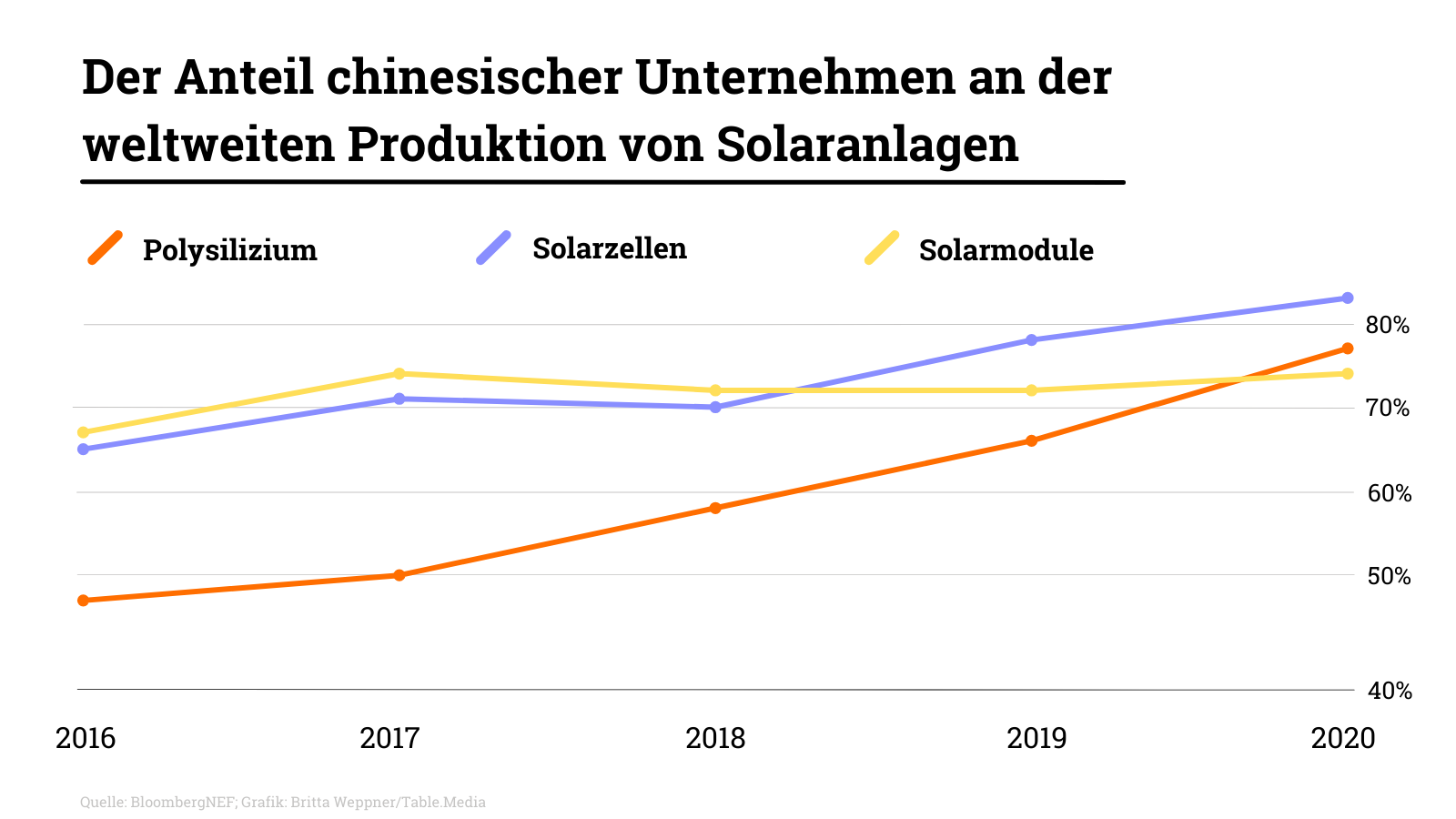 Doch nicht nur China stände dann vor einem Problem. Auch der Ausbau der Solarenergie in Deutschland könnte ins Stocken geraten. Viel des Polysiliziums wird direkt in China weiterverarbeitet. Die Volksrepublik ist Weltmarktführer im Solarbereich und dominiert alle Produktionsschritte. Weltweit stammen drei von vier Solarmodulen und 83 Prozent der Solarzellen aus China. Beim Ausgangsstoff Polysilizium dominiert China 77 Prozent des Weltmarktes. Xinjiang spielt hier wiederum eine besondere Rolle. Geschätzt 50 Prozent der weltweiten Produktion von Polysilizium stammen aus der westchinesischen Region.