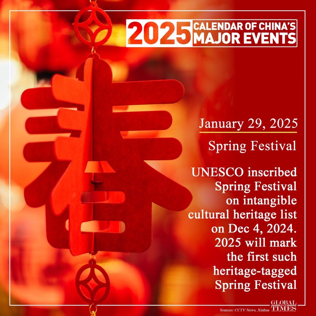 Das traditionelle Frühlingsfest beginnt nach dem Mondkalender mit dem ersten Tag (大年初一), der auf den 29. Januar fällt. Dieses Jahr erhalten die Bürger schon den 28. Januar frei, um den Sylvesterabend (除夕) vorzubereiten, an dem traditionell viel gegessen und nachts mit Getöse (Feuerwerk ist in vielen Städten verboten) die bösen Geister des vergangenen Drachenjahres vertrieben werden.