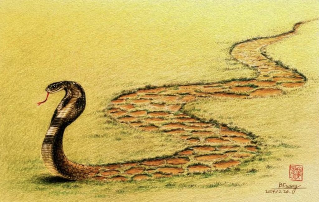 Kuangs zweite Zeichnung zum Jahr der Schlange trägt den Titel 一带一路 (Belt and Road). Eine Schlange, deren Körper sich als Straße durch die Wüste windet, eine Anspielung auf Chinas Seidenstraßen-Offensive.