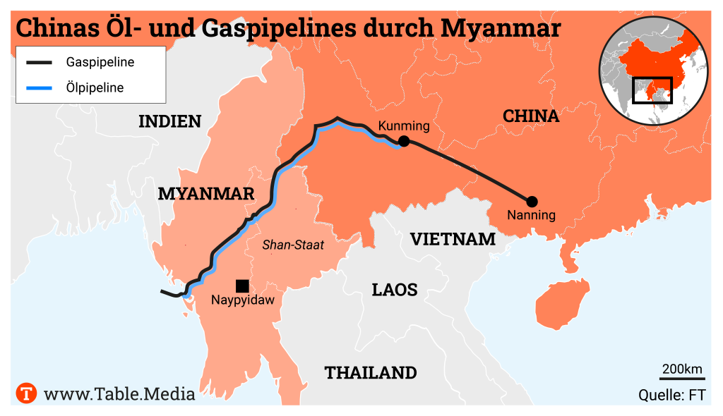 Geostrategisch: Myanmar dient als wichtiger Transporthub. Über den Nachbarn erhält China Zugang zum Indischen Ozean. Es kann Waren und Rohstoffe über diese Route ein- und ausführen und dabei das Nadelöhr der Straße von Malakka umgehen.
