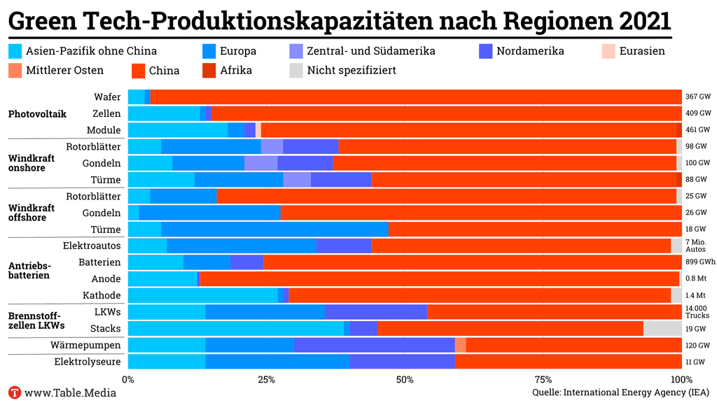 Auch bei Wärmepumpen ist China einer der weltweit wichtigsten Hersteller. Sein Marktanteil beträgt 40 Prozent der Weltproduktion. Die europäischen Importe chinesischer Wärmepumpen und -Komponenten haben sich zwischen 2018 und 2022 von 327 Millionen Euro auf 1,37 Milliarden Euro mehr als vervierfacht (sowohl Wärmepumpen als auch “reversible Wärmepumpen”). China ist laut Internationaler Energieagentur (IEA) einer der wenigen Hersteller mit einem “signifikanten Anteil” von Exporten bei Wärmepumpen. Der Markt in Europa boomt. Bis 2030 sollen allein in Deutschland sechs Millionen Wärmepumpen installiert werden – ein Zubau von 500.000 Einheiten pro Jahr. Die Wärmepumpen-Industrie investiert derzeit viel zu wenig in neue Produktionsanlagen, um die globale Nachfrage zu decken, schreibt die IEA.