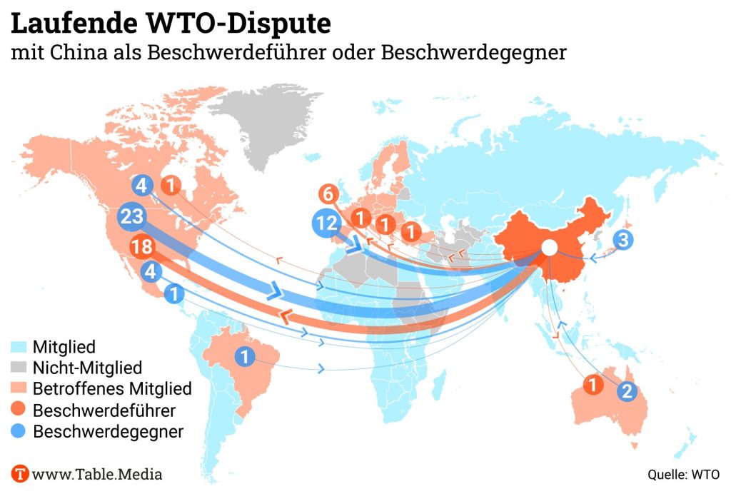 Für Europa sind die WTO-Regeln dagegen maßgebend. “Die EU achtet im Fall der Ausgleichszölle auf chinesische Elektroautos darauf, dass die Maßnahmen im weitesten Sinne WTO-konform sind. Auch China hat die Mechanismen in diesem Fall genutzt und über die WTO-Beschwerde eingereicht”, sagt Zenglein. Ein Blick ins Verzeichnis aktueller WTO-Beschwerden zeigt: Der Mechanismus wird zwischen den Parteien China, EU und USA rege genutzt. Aktuell liegen sechs Beschwerden Chinas gegen die EU vor, 18 gegen die USA. Und umgekehrt laufen zwölf Fälle der EU gegen China und 23 Fälle der USA gegen China.