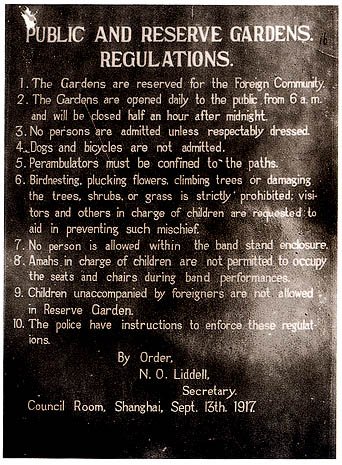 Die tatsächliche Shanghaier Parkordnung aus dem Jahre 1917. Unter Punkt 1 steht: “Reserved for the foreign community”, unter Punkt 4 “Dogs and bicycles are not admitted”.
