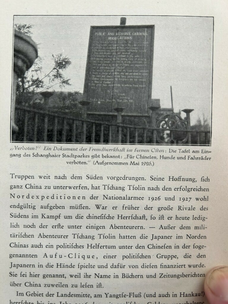 Der Abgeordnete der englischen Arbeiterpartei C. Malone fotografierte in Shanghai im Mai 1926 das Schild mit der Parkordnung von 1917 und veröffentlichte das Foto in seinem Buch “Das neue China” (Berlin 1928, S. 36). Darunter schrieb er, es sei ein “Dokument der Fremdherrschaft” mit der Aufschrift Eintritt “für Chinesen, Hunde und Fahrräder verboten”. Dumm nur, dass das nicht so auf dem Schild stand.