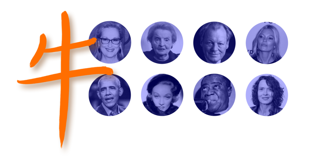Alle zwölf Jahre wieder, werden die stolzen Büffel geboren. 1901 war ein Büffeljahr, genauso wie 1937, 1949, 1961, 1973, 1985, 1997 – und zuletzt 2009. Und weil das chinesische Mondjahr nicht ganz zum westlichen “Jahres”-Verständnis passt, sind zum Beispiel im Januar 1961 Geborene “noch keine” Büffel, wohingegen im Januar 1962 Geborene “noch” Büffel sind. Zu den berühmten Vertretern des Tierkreiszeichens zählen der Jazztrompeter Louis Armstrong (1901), die deutsche Schauspiel-Legende Marlene Dietrich (1901) genauso wie die US-Politikerin Madeleine Albright (1937). Auch der ehemalige US-Präsident Barack Obama (1961) ist ein Büffel, ebenso Willy Brandt (1913) oder die Princess of Wales, Diana Spencer (1961). Aber auch die US-Schauspielerinnen Jane Fonda (1937) und Meryl Streep (1949), das britische Model Kate Moss (1974) und die deutsche Darstellerin Ulrike Folkerts (1961) gehören dazu. Antje Sirleschtov