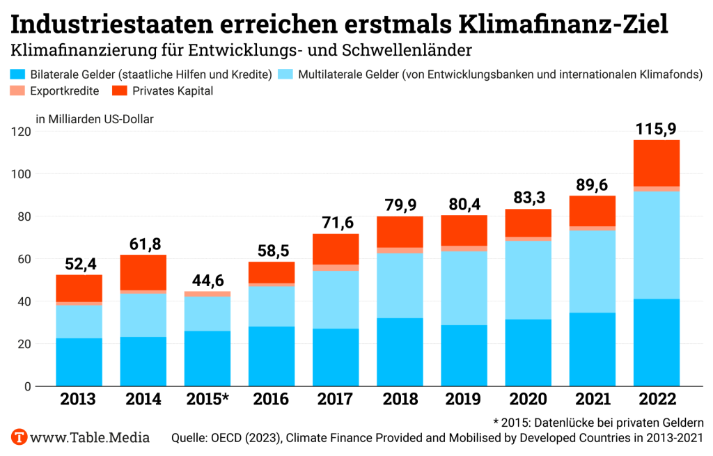 erstmals haben die Industrieländer geliefert, was sie in der Klimafinanzierung an Entwicklungs- und Schwellenländer versprochen hatten: mehr als 100 Milliarden US-Dollar im Jahr 2022. Die neuen OECD-Zahlen dazu kommen kurz vor der Bonner Klima-Zwischenkonferenz, über die wir im Climate.Table ausführlich berichten werden. Wer die großen Geldgeber sind, wer knausert und was das für die Verhandlungen in Bonn zum neuen Klimafinanzziel bedeutet, hat Nico Beckert analysiert.
