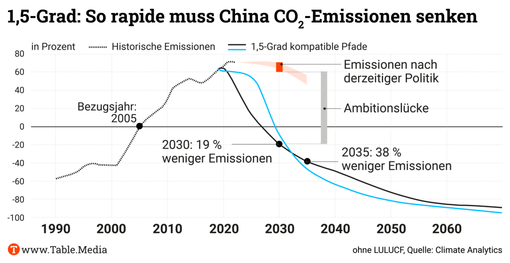Damit die Weltgemeinschaft die globale Erwärmung auf 1,5 Grad begrenzen kann, müsste China seine Emissionen bis zum Jahr 2035 um 38 Prozent im Vergleich zu 2005 und um 59 Prozent im Vergleich zum Jahr 2015 senken. Das würde eine drastische Kehrtwende bei den Emissionen und bisher ungekannte Anstrengungen erfordern. Der Boom bei den erneuerbaren Energien und ein möglicher Höchststand bei den CO₂-Emissionen sollten nicht über die Schwierigkeiten hinwegtäuschen, vor denen China steht. Für ein 1,5-Grad-kompatibles NDC müsste die Volksrepublik den Kohleausstieg immens beschleunigen und große Anstrengungen im Industriesektor umsetzen.