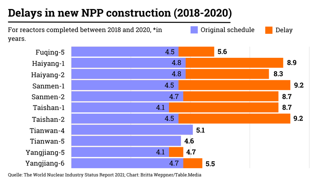 As ambitious as these goals may sound, the reality on the ground is different. Between 2016 and 2018, authorities did not approve a single new nuclear power plant (China.Table reported). In fact, 58 gigawatts of nuclear capacity were supposed to have been connected to the grid two years ago. This target, however, was missed by several gigawatts. After the 2011 reactor disaster in Fukushima, Japan, Chinese authorities also became more cautious. At that time, the government ordered a thorough safety review and imposed a moratorium on new projects. The construction of already approved reactors was also delayed. Two reactors have been under construction since 2012, and three others since 2015, although some of them were originally scheduled for completion within four years, as one builder and operator had assured.