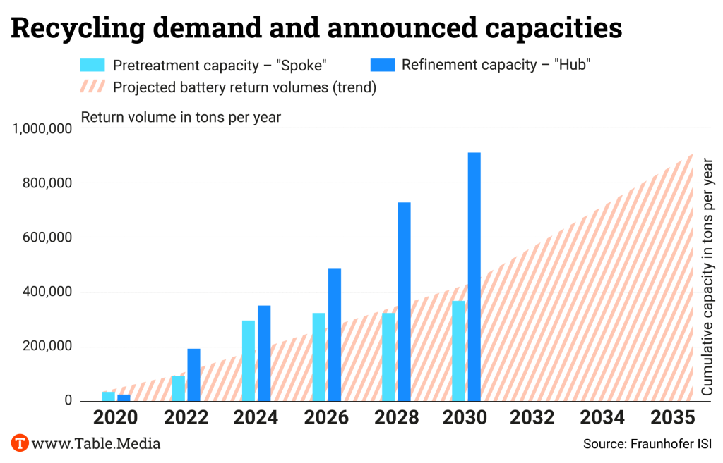 As the Fraunhofer Institute has calculated, European recycling capacity currently significantly exceeds demand. The annual capacity of hubs is around 350 kilotons, while that of spokes is a good 300 kilotons, almost twice as much as in the previous year. This contrasts with a battery return volume of barely 200 kilotons. However: “The capacities also include announced projects. How many of these will be implemented is another question. We assume that not everything will be realized,” Thomas Schmaltz points out.