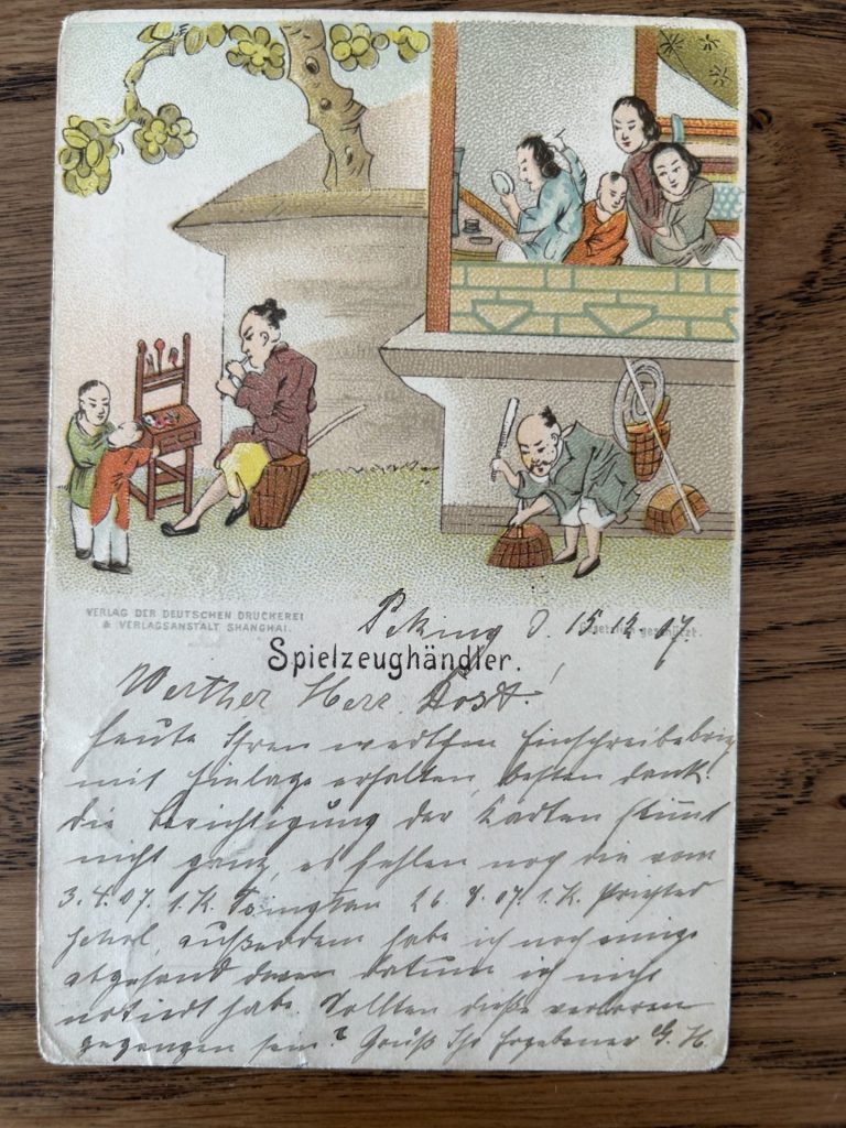 Toy sellers were already a familiar sight in cities in the 19th century. When foreign colonial powers forcibly seized concession territories, their soldiers and merchants sent home postcards with folklore motifs featuring toy vendors. They offered dolls and animal figurines kneaded from dough, which are still sold at New Year’s markets today.