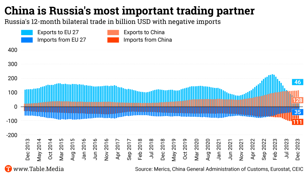 Conversely, Chinese imports from Russia have continuously increased throughout the conflict. According to the US think tank Atlantic Council, China’s direct exports to Russia have only briefly declined twice since Moscow’s invasion of Ukraine: Both times when Chinese companies feared sanctions risks. This was the case in the early days of the Russian invasion in early 2022. The second instance saw a slight decline at the beginning of this year due to stricter Western sanctions imposed in December 2023 and production pauses for the Chinese New Year. The decline was temporary in both cases.
