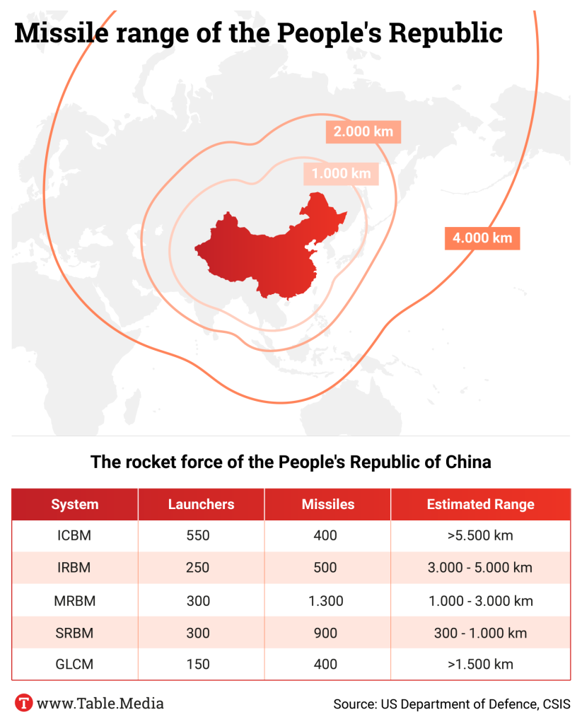 While China previously only had a small nuclear arsenal, the Pentagon estimates that its number of operational nuclear weapons has risen to more than 600. By 2030, it is likely to have more than 1,000 warheads – approaching the figure of 1,600 each for the USA and Russia. The Pentagon believes that China will continue to expand its arsenal after that. China’s military modernization “suggests that it seeks the capability to inflict far greater, overwhelming damage on an adversary in the context of nuclear war”.