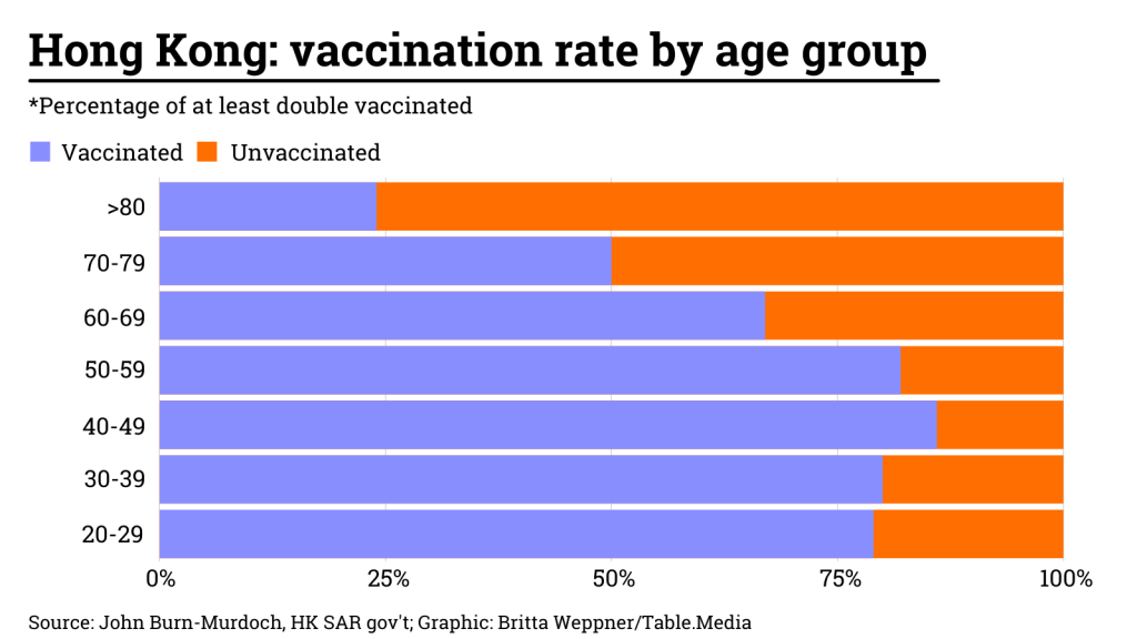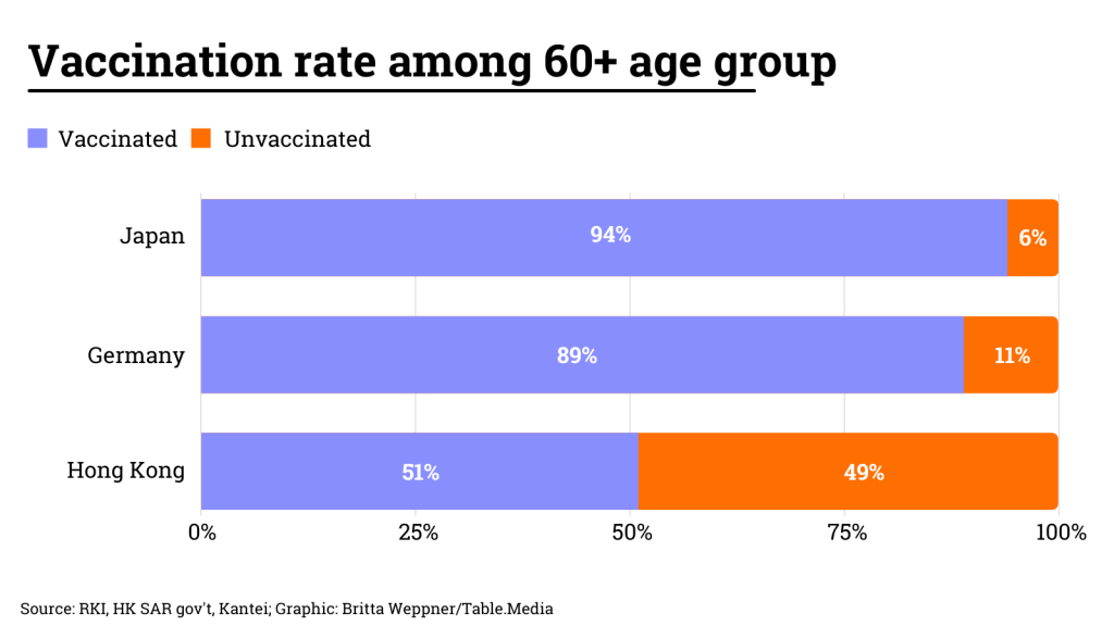 German virologist Christian Drosten considers the current situation in Hong Kong highly interesting from a scientific point of view. In hardly any other highly developed, statistically well-monitored region with a solid healthcare system is the vaccination rate among elderly citizens this low. Whereas in Germany or Japan more than 90 percent of its oldest citizens are vaccinated, the rate in Hong Kong at the beginning of the Omicron wave was only 34 percent – for the first vaccination. Only a little over 20 percent are fully vaccinated, let alone received the second jab. As a result, one in twenty infected Hong Kong residents is currently dying.