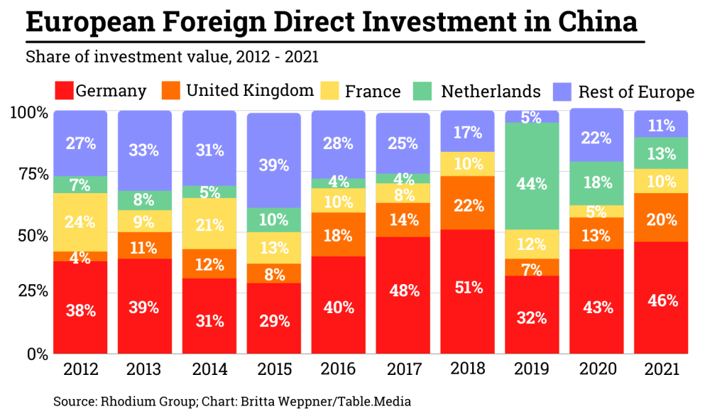 Volkswagen, BMW, Daimler and BASF alone accounted for about 34 percent of all European investments in China between 2018 and 2021, according to Rhodium. “Our findings point to a widening gap in how European firms perceive the balance of risks and opportunities in the Chinese market,” the authors conclude.