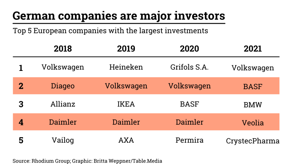 Yet, the number of companies that continue to show unlimited enthusiasm for China is steadily declining. While investments in the People’s Republic are growing in volume, the majority of the money comes from fewer and larger companies. The top ten European investors in China have accounted for an average of nearly 80 percent of all investments over the past four years, according to a new analysis by Rhodium Group. German conglomerates rank among the top investors.