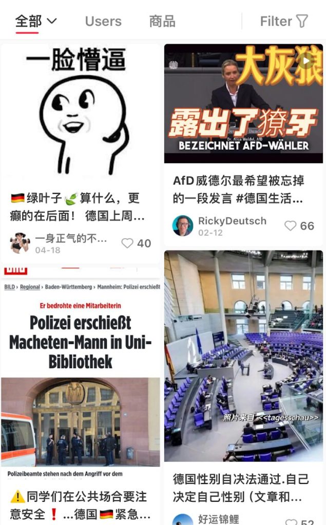 Numerous posts on social media platforms, such as the app Xiaohongshu, popular among expatriate Chinese, cast a rather positive light on the AfD. For example, they claim that the party would expel “dangerous migrants” and work to lower taxes.