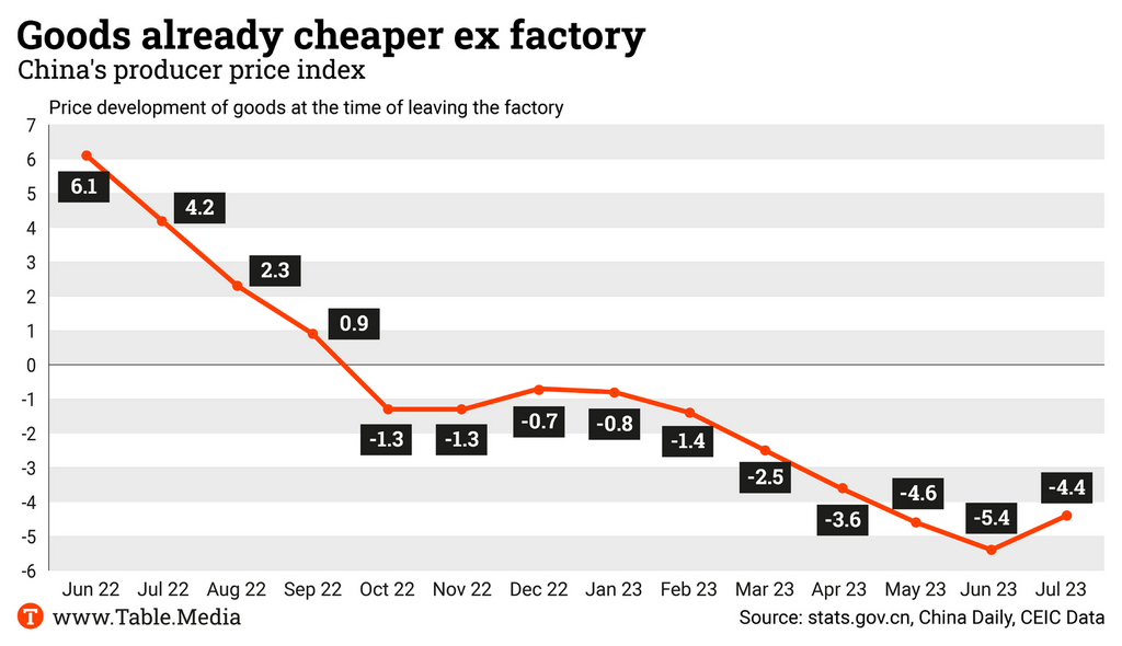 Even producer prices saw a slight turnaround in July, albeit remaining in negative territory. The decline in producer prices has slowed from minus 5.4 percent to 4.4 percent. However, there is still a considerable distance to go until reaching the zero line, indicating stagnant prices.