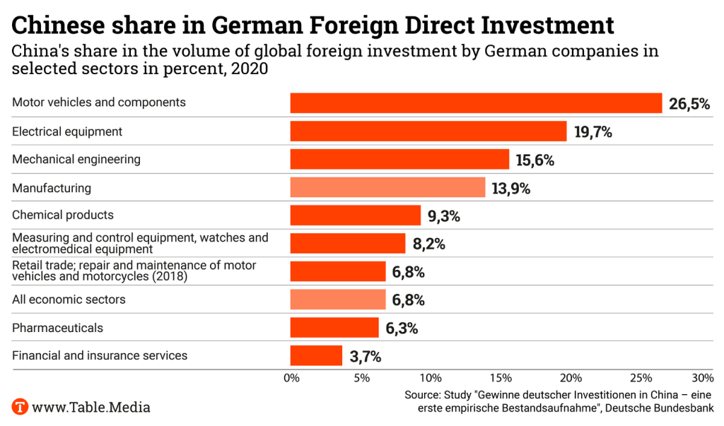 Is it the all-clear? According to a new economic study, profit flows from China to Germany are not as high as the dependency debate would suggest. In some years it was only in the single-digit billions. The study was conducted by the Bertelsmann Foundation, IW, Merics and BDI, some of the most important actors for economic policy assessments on China. Moreover, since German companies generate the capital for investments in China’s domestic market, no funds flow out of Germany.