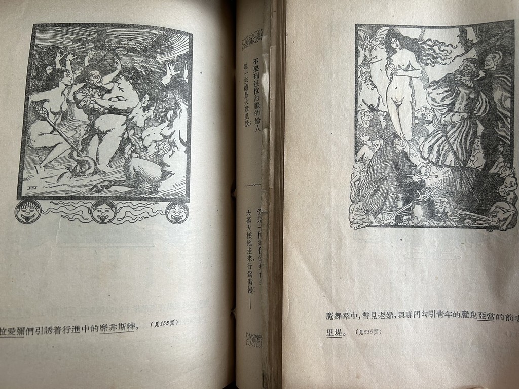 I found both volumes in a Beijing antiquarian bookshop. Guo had translated them from the German edition (Schröter 1924) and adopted the 163 pen drawings by Franz Staffen. His illustrations, for example, of the infernal temptations, are so revealing that the young Xi should be forgiven for trying to keep this copy for as long as possible.