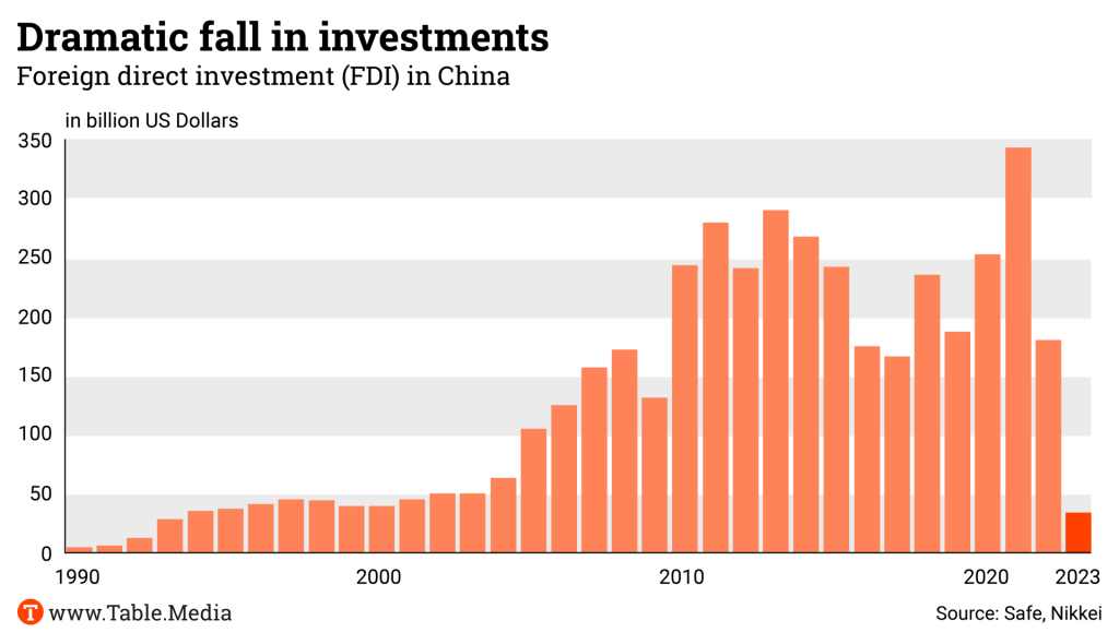 In stark contrast, the figures released by the Chinese State Administration of Foreign Exchange (Safe) on Sunday paint a different picture. According to them, net direct investments flowing into China from around the world in 2023 amounted to only around 33 billion US dollars. This marks an 82 percent decrease from the previous year and the lowest value since 1993.
