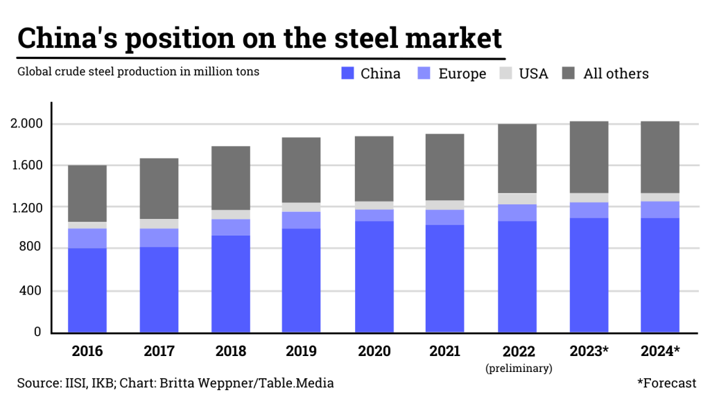 To achieve carbon neutrality by 2060, Beijing digs even deeper into its toolbox. Last year, steel production was cut back significantly to curb climate-damaging emissions. But due to the economic downturn, goals have recently been watered down again (China.Table reported).