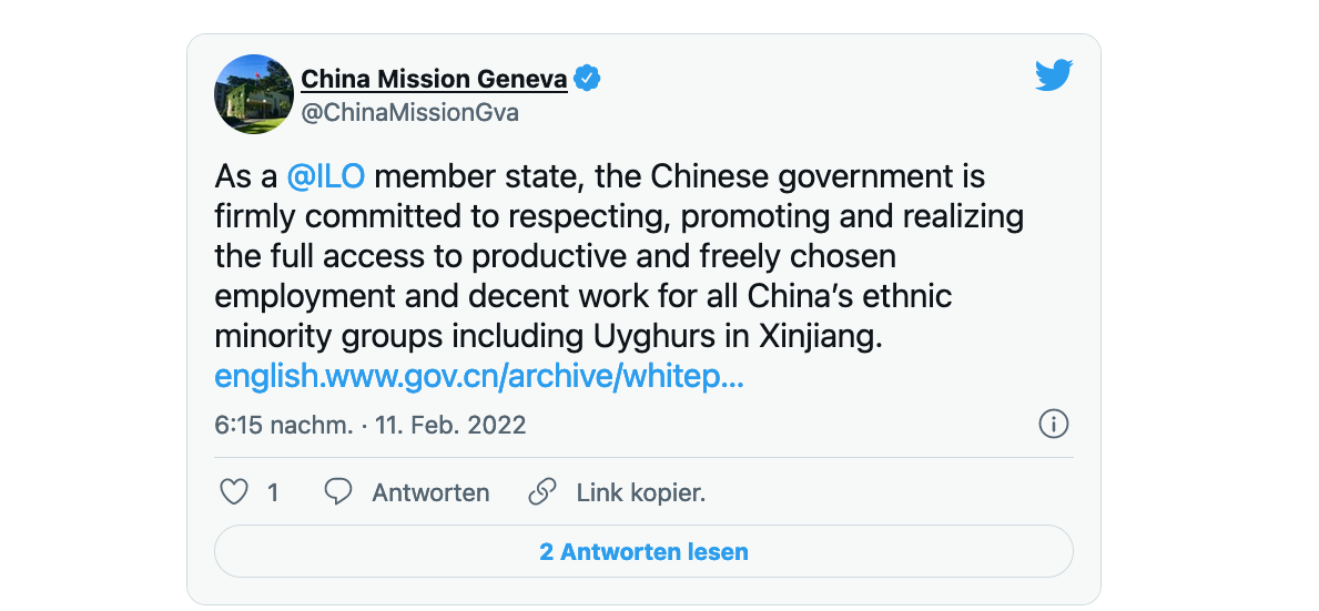 The demand to close the existing information gaps followed the publication of the recent report by the International Labor Organization (ILO) of the United Nations. Its expert commission sharply criticized the situation in Xinjiang at the end of last week and called on the Chinese government to align working conditions in the region with international standards.
