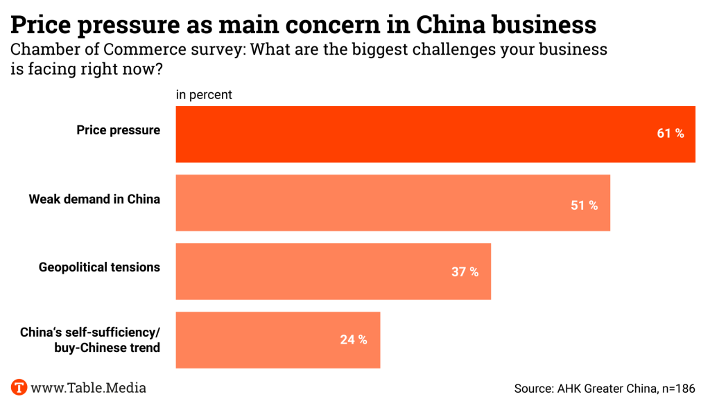 75 percent of the companies surveyed reported overcapacity in their sector. Almost all (96 percent) stated that this overcapacity affected their business. In addition, low prices are currently by far the biggest concern for companies, according to the Chamber survey. The ranking of their challenges is as follows: