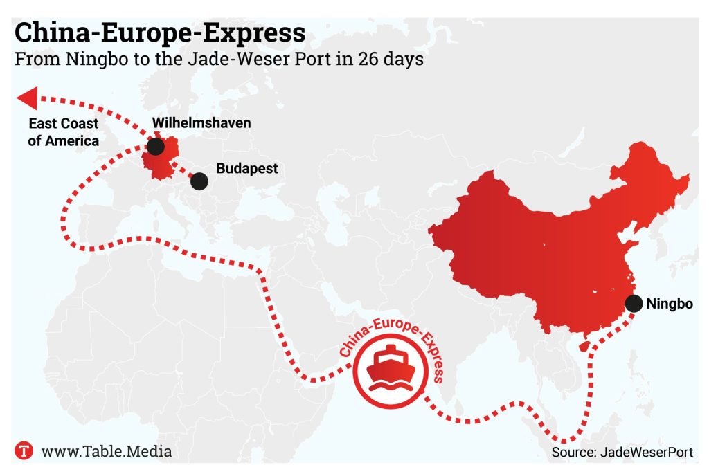 From now on, the China-Europe Express route will connect the cities of Ningbo and Wilhelmshaven – the first container ship is expected to arrive at JadeWeserPort today. This will shorten the route from China to Europe from 40 to 26 days, as the container ships will no longer make (time-consuming) stopovers.