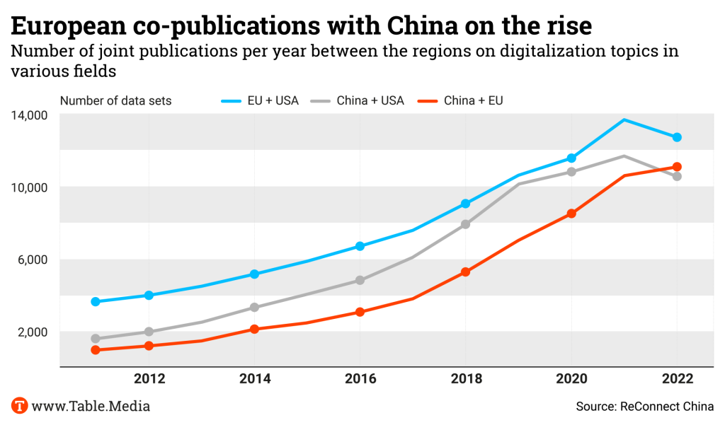 While the United States still leads, they have been publishing less with China since 2021. In 2022, according to the study, co-publications between Europe and China already surpassed those between the USA and China. “We believe that this downward trend is related, among other things, to the larger geopolitical situation and the tense relationship between China and the USA,” says Philipp Brugner, one of the authors of the study, in an interview with Table.Media.