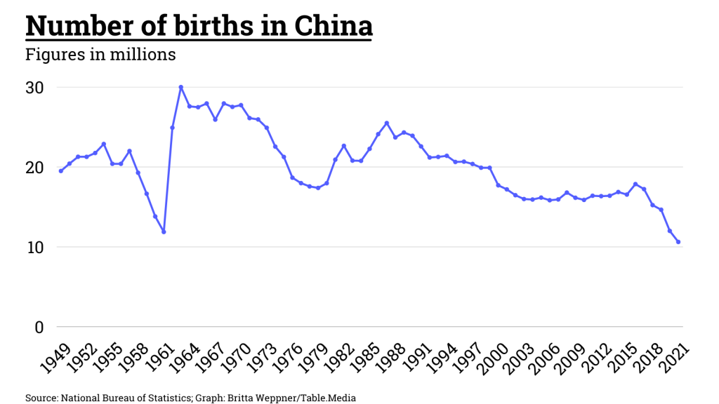 Birth rates in the People’s Republic have been falling rapidly, and not just since the start of the Covid pandemic. Last year, according to data from the National Bureau of Statistics, only ten million births were recorded – the last time so few children were born in the People’s Republic was in 1949 (China.Table reported). The declining birth rate has been observed for more than five years. Officially, only 1.3 children were born per woman last year. According to some demographers, the unofficial figure is as low as 1.15. The ensuing labor shortage is fatal to China’s desire for economic recovery.
