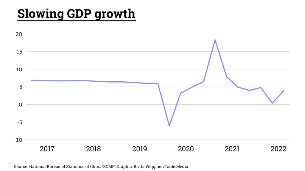 Originally, the data should have been published last week. No reason was given for the delay. However, observers assumed that all attention was supposed to focus on the CP Congress (China.Table reported). Other economic data on Monday painted a mixed picture: While industrial production rose a substantial 6.3 percent in September, retail sales growth was slower than expected at 2.5 percent. The official urban unemployment rate also increased for the first time in four months, rising 0.2 percentage points to 5.5 percent.