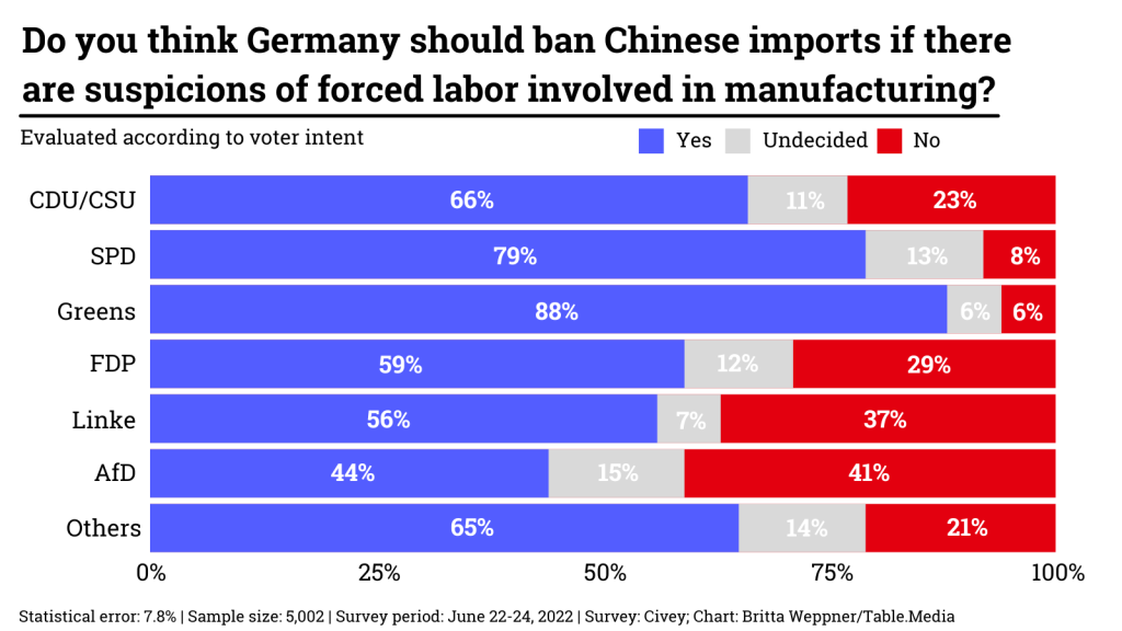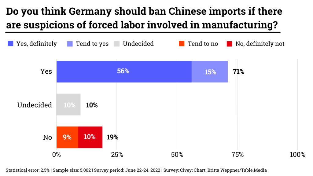 Companies are also beginning to feel the pressure – for example, the German car manufacturer Volkswagen, which operates a plant in the Xinjiang region. That is why Table.Media wanted to find out what the German public thinks about the issue and our own behavior.