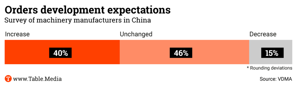 These figures are particularly alarming in the long-term trend. In spring 2018, the number of companies with a “good” business situation was still 64 percentage points larger than those in a “bad” situation. The ratio has reversed. The bad assessments now dominate with a negative lead of 11 percent. In an interview with China.Table, the head of the VDMA office in Beijing, Claudia Barkowsky, lamented the shrinking technical advantage of German manufacturers – particularly in the mid-range segment of machine tools.